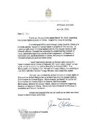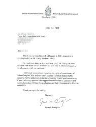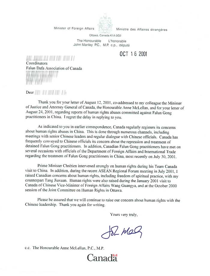 2001年10月16日,加拿大外交部部长John Manley先生给加拿大法轮大法协会复信指出:加拿大一直关注迫害法轮功信仰自由,并继续向中国领导人表示关注。