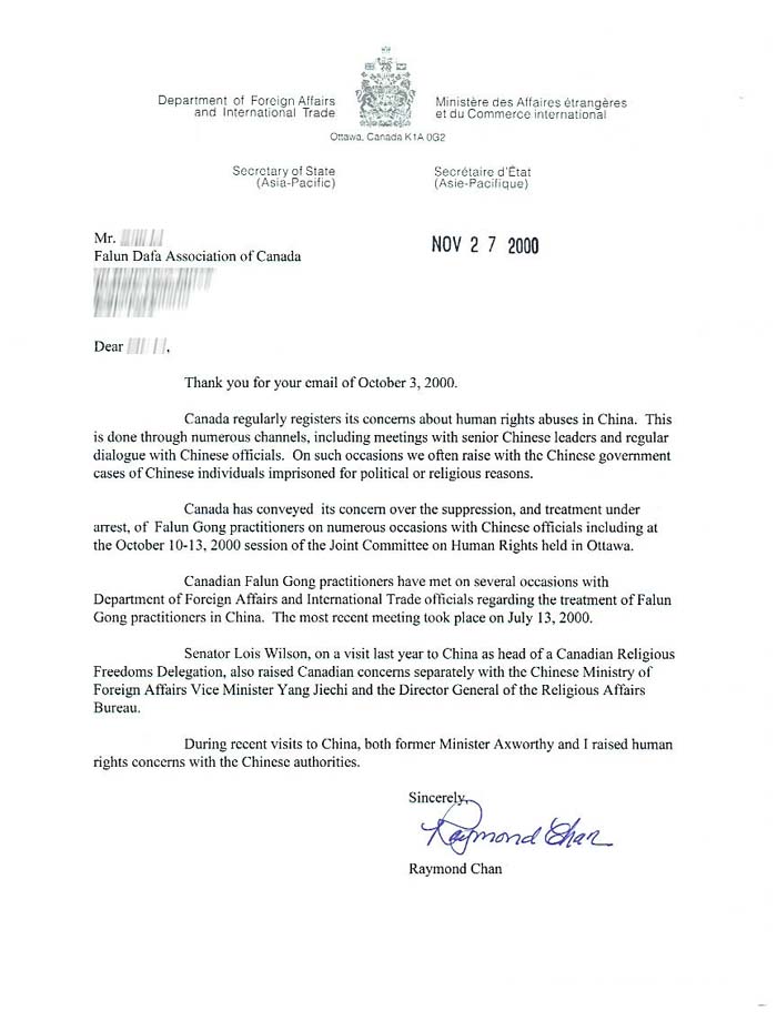 2000年11月27日,加拿大外交部亚太司司长Raymond Chan先生给加拿大法轮大法协会复信指出:加拿大多次向中国政府表达对镇压法轮功的关注,包括在2000年10月10日至13日的中、加双边人权对话期间。