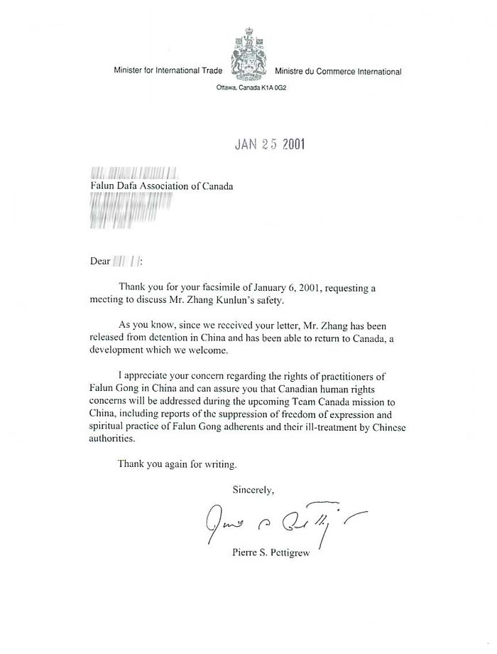 2001年1月25日,加拿大外贸部部长Pierre S. Pettigrew先生对释放加拿大公民张昆仑教授表示欢迎。同时向加拿大法轮大法协会表示加拿大赴中国的贸易代表团将在访问中国期间向中国官员提出有关镇压法轮功信仰、言论自由、和虐待法轮功学员之事。
