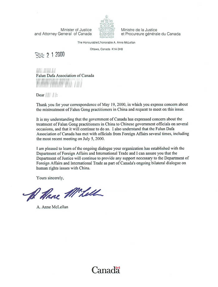 2000年7月21日,加拿大司法部部长Anne McLellan女士复信加拿大法轮大法协会,表示加拿大司法部将给加拿大法轮大法协会提供必要的声援。