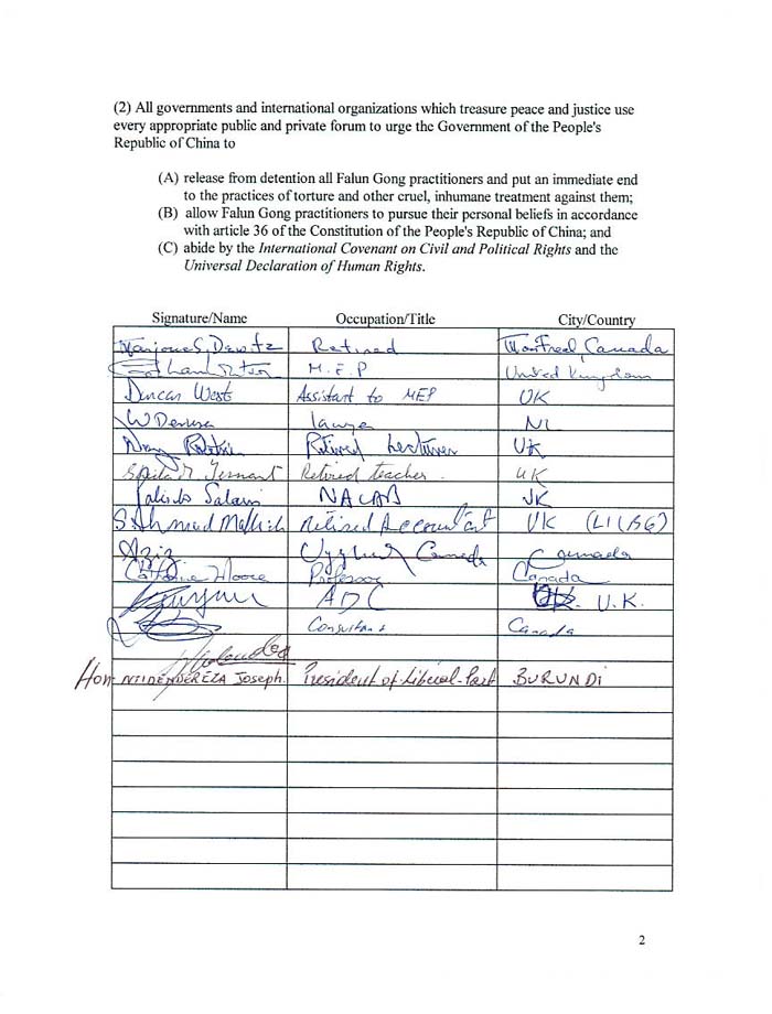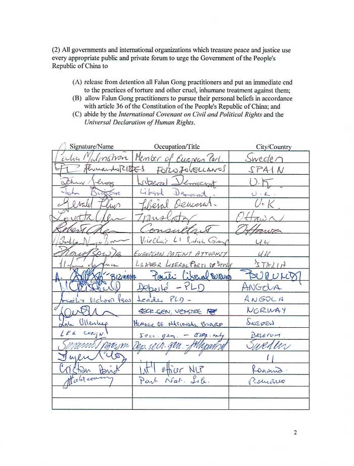 2000年10月26日至28日,包括多名国家首脑参加的国际自由党年会在渥太华举行。会议期间,加拿大法轮功学员参加了有关中国人权方面的研讨会等,向各国政要介绍了法轮功真相和发生在中国的严重迫害,引起了与会者的极大同情和关注。包括意大利自由党领袖、布隆迪自由党主席、比利时自由党秘书长、安格拉自由党主席及国会议员、挪威自由党秘书长、瑞典、英国等国的欧盟议员等十余国政要共同签署了一封呼吁信:要求中国(江泽民)立即停止迫害法轮功,释放所有学员、遵守中国宪法和国际人权公约。