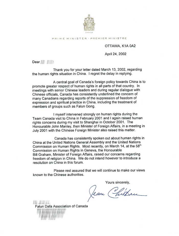 (信七、加拿大总理Jean Chretien2002年4月24日给加拿大法轮大法协会的信件)