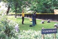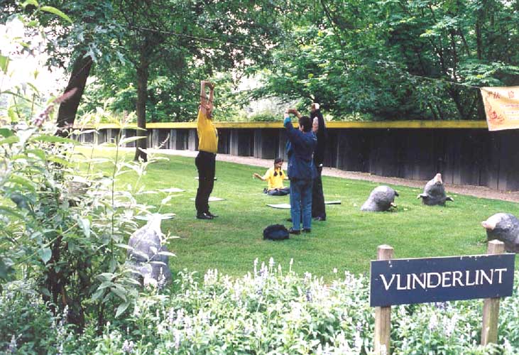 城堡公园虽然名气不大,但步入之后犹如人造仙境。五彩缤纷的玫瑰园,别具一格的小森林以及荟萃精华的各国园艺,配上一些温和的飞禽走兽,竟在短短的一个周末吸引来数千游客。6月29日,30日及7月6日,7日,德国,比利时及荷兰学员汇聚在这个美丽的地方,进行五套功法表演。行似流水的动功,站如松柏的抱轮吸引着每个过路游人。尤其是表演第五套功法时,行人都停住了脚步,路上层层叠叠站满了人。他们都屏住呼吸,似乎伴随我们进入了静的境界。超凡脱俗的静功与这幽雅美妙的环境浑然一体,这个场面唯有天人合一是最恰当的形容了。很多游人问:这就是法轮功啊。中国政府为什么镇压。有的学员忙着把大法报章“SOS”发给游人并讲清真相。