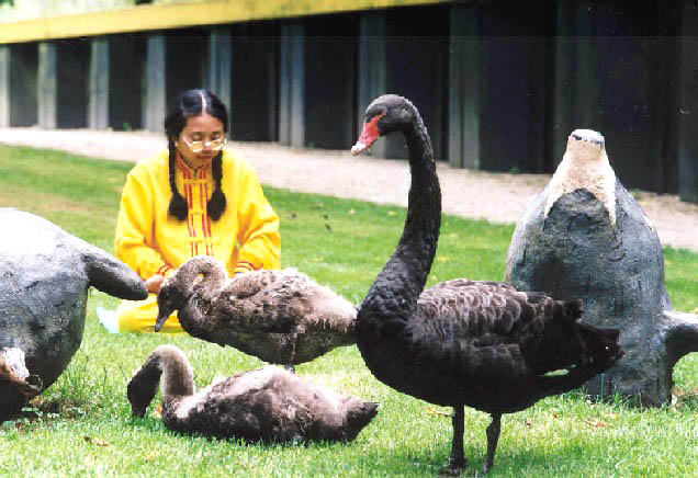 黑天鹅妈妈每天下午3点按时带领两只小天鹅来到我们的炼功点。当我们炼功时,它们趴在旁边,或穿行在我们中间,并不打扰我们。在最后两天,天鹅爸爸也来了。这一景观也引来很多游人。