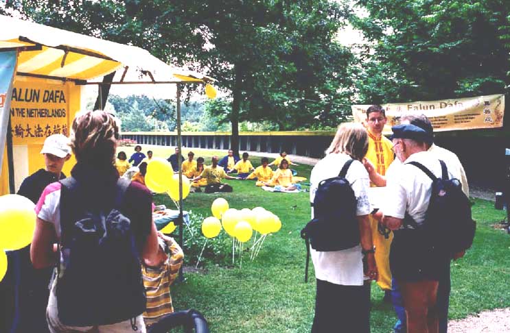 城堡园艺公园位于荷兰与德国的边界小镇阿森,面积有40个足球场大小。由于地处偏远,事先我们还不知道这个美丽的园林。6月初的一天,一位同修接到个陌生人的电话,他说城堡园艺公园将举办亚洲文化节,作为组织者,他邀请我们参加亚洲节展示法轮功五套功法并介绍大法。这位先生还说,他对东方的修炼方式非常感兴趣,他从互联网上找到了有关法轮功的资料,大法精深的内涵吸引了他,本来邀请其他功法来表演的计划改为特邀法轮功。同时他建议在“中国园”的入口处做为我们演示的地点,并在路旁为我们设置两个摊位用于摆放洪法资料。雨天,安排我们到宽阔的室内植物园洪法。他希望我们保证两个周日必须到位,预计周日的游人达4000人以上。其他由我们自己灵活安排,因为他认为我们天天来这里太辛苦了。