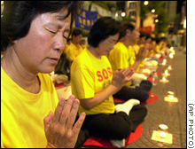 图片:法轮功学员说近100名学员被拒绝进入香港。法轮功在中国大陆被[江氏集团]禁止。