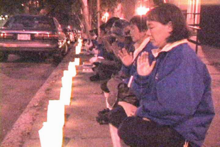 | 2002年7月19日,渥太华由“莲花灯”组成的烛光守夜。 | 黑夜中的“莲花灯”:三年腥风血雨,莲花不折不染。 |