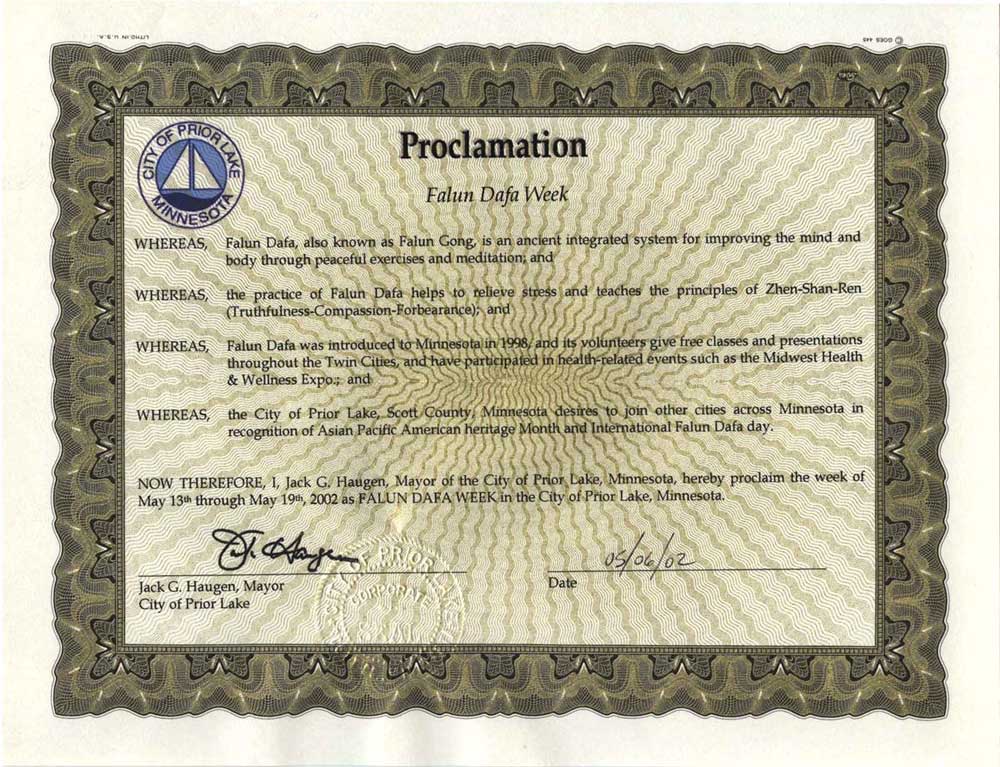 鉴此,我,杰克.郝根,明尼苏达州原湖市的市长,特此宣布2002年5月13日至19日为明尼苏达州原湖市法轮大法周。