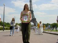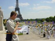 一位记者很高兴能在游行结束时在铁塔对面的人权广场上看到法轮功学员集体炼功,马上拍摄了下来。