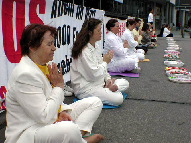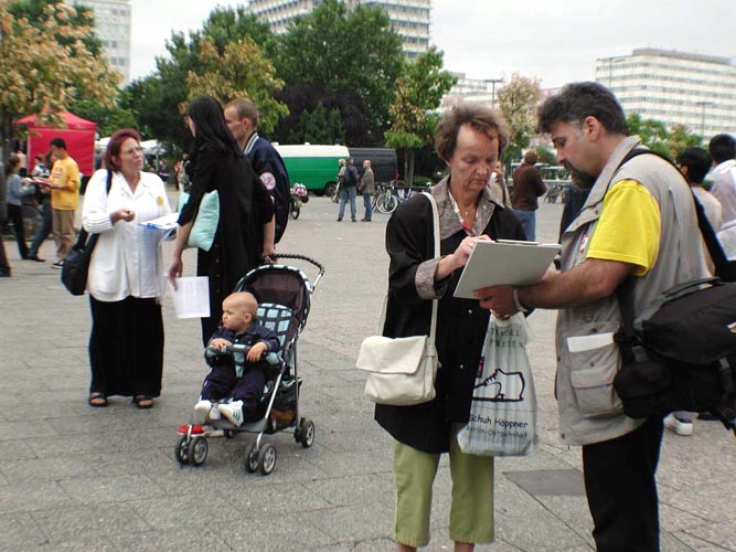 为了向更多的人们讲清真相,柏林的活动分三处举行,上午在中国大使馆前、下午在亚列山大广场,晚上在纪念教堂广场举行了烛光守夜。人们纷纷为祥和宁静的炼功场面所吸引,真相资料被拿得很快,人们很乐意跟学员交谈。一位学员正和另一同修说话,一位行人从他们身边走过后,立即转回来主动向学员索取资料。当被问到是否愿意为营救熊伟签字时,人们毫不犹豫地签了字,这天签字的人特别多。和学员交谈的人中有不少是公务人员。这天从世界各地来柏林旅游的人特别多,他们都得到了不同语种的真相资料。不少居住在德国或来德国旅游的中国人也很乐意拿真相资料和光盘,有的和学员作了长时间探讨。大家感觉是,现在人们比以前更容易接受大法,支持我们的人越来越多,人们见到大法弟子似乎感到很亲切,有的人大老远看到横幅就赶过来要资料。