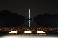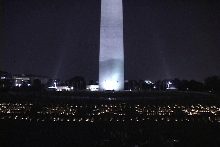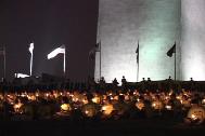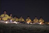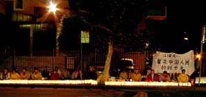 当夜幕降临的时候,弟子们点燃了许多蜡烛,摆上了被迫害致死的同修的照片和白色的花圈,寄托我们的哀思。弟子们静静地打坐、正点发正念直至凌晨,路过此地的行人看到此情此景非常感动。