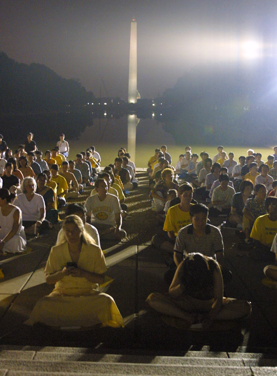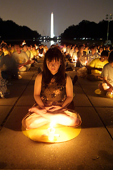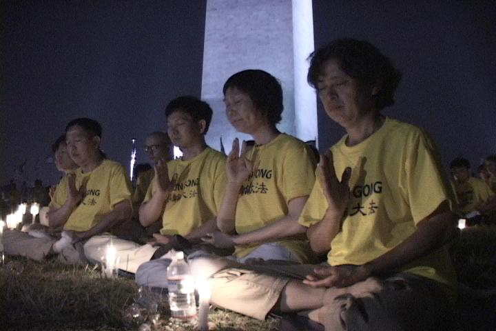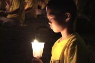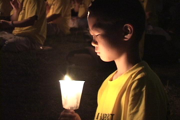 胸前佩戴着小白花的大法弟子默默静坐,每半小时集体发正念坚定除恶。强大的正念,闪闪的烛光,聚成黎明前的曙光,黑暗正在被驱尽,法正人间的春天的脚步又近了。