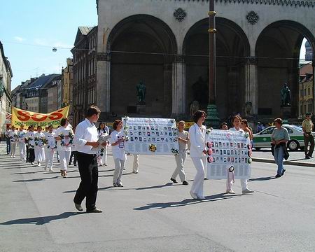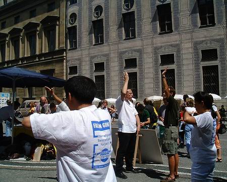 周六的慕尼黑阳光明媚,游人如织。法轮功学员们从上午开始在市中心的奥德恩广场举行大型集体炼功和征集签名,期间每小时一次通过高音喇叭向路人介绍由江泽民发起的这场邪恶的镇压事实和国内外法轮功学员面对镇压的和平表现,并向支持我们的公众表示感谢。