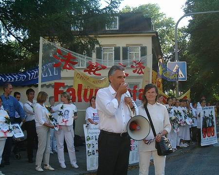 国际人权协会慕尼黑分部负责人也到场发表了支持演讲。下午整齐肃穆的SOS游行队伍从广场出发,穿越市区,前往中国驻慕尼黑领事馆请愿。路人被我们庄严宁静的场面所吸引,有人就跟着我们一起走到领事馆,有人对学员说:“你们做得真好,我已经很长时间没有见到过这么多和善的面孔在一起了。”在中领馆前,学员集体炼功,发正念,齐唱“法轮大法好”。国际人权协会慕尼黑分部负责人和学员代表一起将请愿信投入领馆信箱。晚上学员继续在领馆前烛光守夜,正好一辆旅游大客车满载着一车大陆的中学生游客来领馆办手续,在他们结束欧洲之行前夕,也有缘在这里听闻真相。