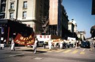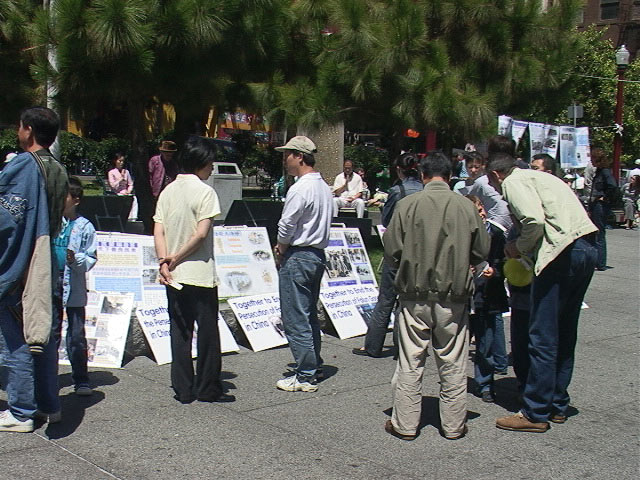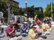 学员们一大早就在旧金山市的市政厅、金门公园、华盛顿广场三处进行了集体大炼功。宁静祥和的炼功场面吸引了许多行人和游客。许多从世界各地来旧金山的游客一下大客车,就来看我们的真相展板、拿资料、和我们攀谈、并照相留念。