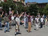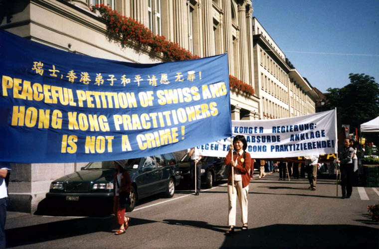 早上10点钟,游行开始,队伍经联邦议会大厦向中国驻瑞士大使馆方向进发。行进行列中,“SOS紧急救援受迫害的中国法轮功学员”、“法轮大法好”、“瑞士、香港学员和平请愿无罪”等横幅特别醒目。伴随着大法音乐“普度”“济世”,弟子们神情庄重,静默地行走,整个游行队伍肃穆、凝重,很多游人驻足观看,主动索取真相材料。瑞士国家法语、德语、意大利语电视台、电台的记者,随队伍而行,进行采访和录像,并于当天下午和晚上作了正面报道。