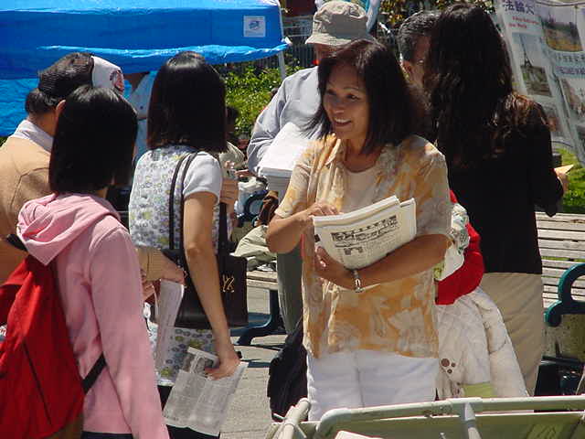 炼完功, 学员们分几路沿街分发真相材料。又到中国城花园角和中领馆前集体发正念。