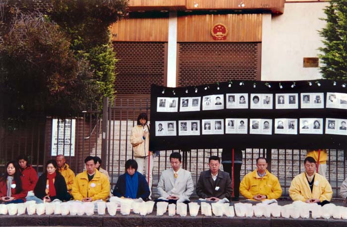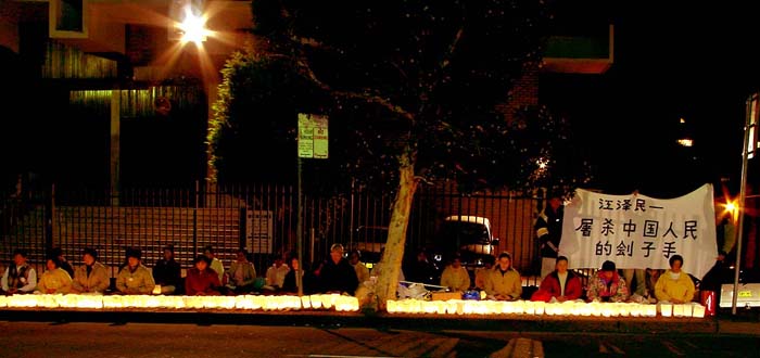旧金山湾区法轮功学员烛光守夜抗议迫害三周年。北加州旧金山湾区大法弟子于七月十九日晚上,在中国驻旧金山领事馆前马路旁边举行烛光守夜悼念活动,同时向世人讲清真相,并集体发正念,清除另外空间破坏大法的邪恶因素。