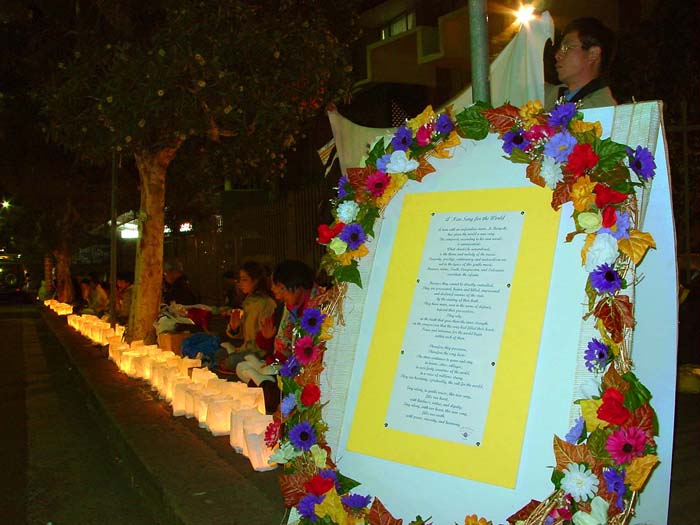 会场里展示着部分受迫害致死法轮功学员的照片。旁边的大花环上写着“一首献给世界的新歌”。沿路边整齐地摆放着438盏白色的小烛灯;几位大法弟子手举着“江泽民一一屠杀中国人民的刽子手”的横幅,场面庄严。过往行人流露出理解的眼神,索要并询问迫害真相资料及大法信息,过往车辆亦不断鸣笛示意支持。