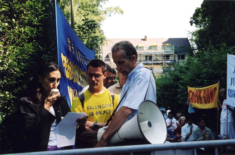 译文:7月19日在巴黎,上百名法轮功学员和支持者围绕著中国大使馆举行了以“三年的镇压,三年的勇气,但是不应该有的三年”为主题的紧急救援大游行。不少政界人士表示了支持,有的还参与了游行;数家国际及法国媒体进行了采访,不少法国民众纷纷表示对法轮功的支持。