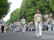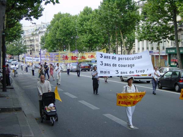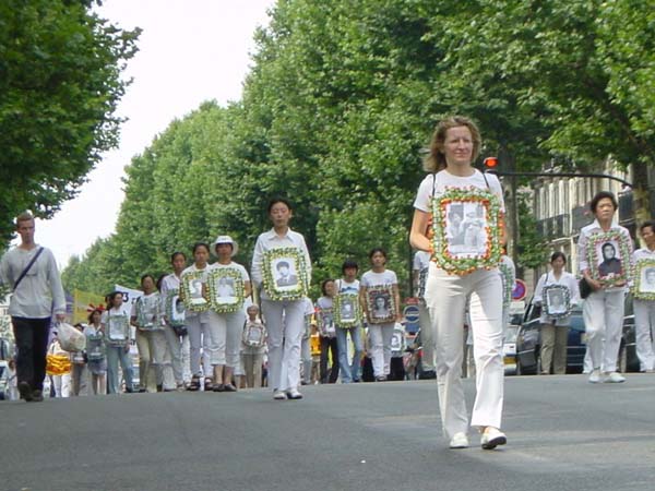 【明慧网2002年7月22日】继七月十九日的紧急救援大游行后,法国大法弟子于七月二十日下午又一次从巴黎的共和国广场到巴士底广场举行了以紧急救援中国受迫害的法轮功学员为主题的大游行。游行队伍中就充满了宁静,祥和,肃穆的气氛,整条大街上都回荡着普度和济世的音乐。在大街的两旁,人们驻足观看,询问和了解有关中国法轮功学员遭受迫害的情况。