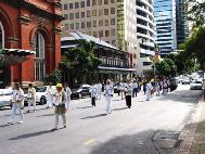 尔后,于下午1点钟,法轮功学员开始环绕市中心的封路大游行。最前面是巨大的花圈,而后一辆装饰着《转法轮》模型的卡车和“我们一起结束镇压”等横幅,女学员们身着白衣白裙,手持死难学员的照片,男学员身着黑色西装紧跟其后。 值得一提的是,在长期的与法轮功学员接触观察后,警方对法轮功学员有坚实的信赖,几次重要活动都批准我们的封路游行。第一次封路游行时,警方如临大敌,三步一岗,五步一哨,生怕有任何闪失。之后的游行,警察人数越来越少,这一次,几乎都找不到警察,只有在路口,看到一个警察在中间示意路人车辆止步。