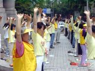这一日,汉城地区的数十名韩国学员来到中国驻韩大使馆对面的韩国银行前面,进行了和平请愿和讲清真相活动。12点55分(北京时间11点55分)至1点10分开始了与世界各地的大法弟子同步发正念的活动,庄严神圣的正念之场和大法弟子的浩然正气震撼寰宇。他们又向人们展示了优美舒展的法轮功前四套功法。这里人潮如流、车水马龙,市民们望着“法轮大法是正法”、“法轮大法好”和“江泽民立即停止对法轮功的镇压”等大横幅,眼里闪现出敬佩的目光,并认真阅读学员发给的真相传单。