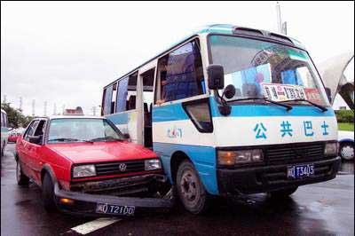 人民网7月21日消息,19日由于雨天路滑,不少地段发生撞车事故,图为下午15时35分,在莲阪富山大转盘发生一起的士车(DT2100)与中巴车(DT3403)争道抢行发生相撞,造成部分道路受阻。