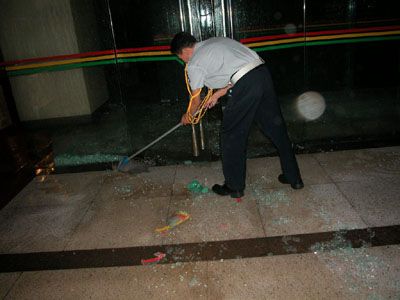 图为保安正在清扫被冰雹击碎的报业大厦大厅玻璃