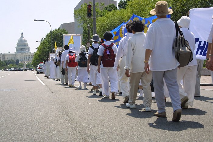 上午十时,法轮功学员列队游行,他们从中国大使馆出发,经康涅迪格大道,宾夕法尼亚大道和宪法大道,游行至国会山西草坪。他们举着写有“一起结束在中国大陆对法轮功的迫害”、“善良的人们请来了解法轮功的真相”、“法轮大法好”等横幅,并沿路播放法轮功的音乐“济世”。