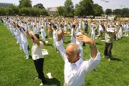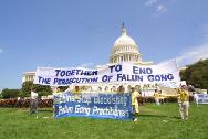 正午时分,队伍游行至国会山并在那里演示了法轮功的五套功法。十几位美国国会议员或其代表,“世界反酷刑组织”、“美国国家妇女组织”、“宗教与公共政策学会”等十几个非政府组织的领袖或其代表,一名欧洲议会议员以及支持法轮功的人士也来到国会山与他们一起举行大集会。法轮功学员用打坐的垫子排成“停止迫害”(End Persecution)的字样,并举起横幅环绕在国会山的草坪上。出席集会的各位政界要人和非政府组织领袖在发言中盛赞法轮功的“真善忍”原则和和平抗争的精神,并严厉谴责在中国大陆所发生的对法轮功学员的非法监禁、酷刑、虐待和杀害。有一位发言者表示将继续与法轮功学员站在一起“肩并肩、手挽手、心连心”,为坚持信仰自由而努力。