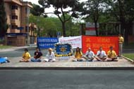 2002年7.20三周年期间,部分西班牙法轮功学员在中国大使馆前炼功、发正念,呼吁国际社会制止中国江氏集团对法轮功的残酷迫害。