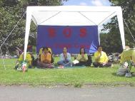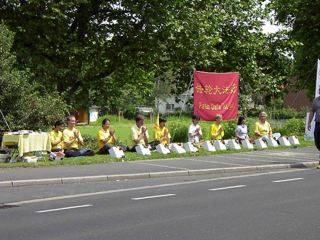 接着又开始了从市中心到Bad Godesberg的游行。这次在一位友好的警察的陪同下,我们游行穿过了购物中心──这里曾是波恩的外交官们的居住区。当看到被虐杀的年轻的大法弟子们的相片、横幅和展板时,人们脸上的表情是那么的严肃。