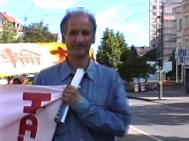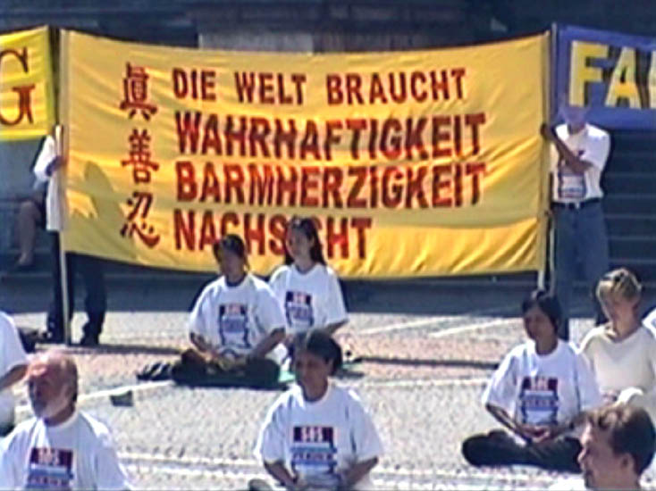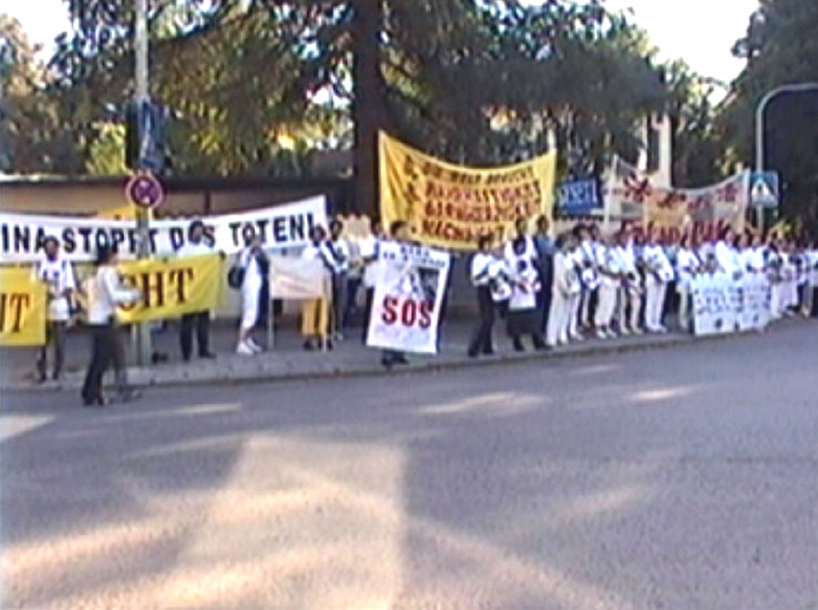 真善忍德语横幅在游行队伍中国际人权组织的负责人也在游行队伍中走了两个小时游行终点站,法轮功学员们在中国领事馆对面发正念