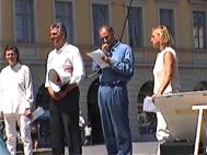 世界需要真善忍慕尼黑法轮功学员在市中心大广场上身材魁梧的德国警官已经修炼法轮功四年了,他热心地拿着话筒协助现场的反迫害演讲