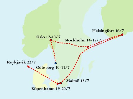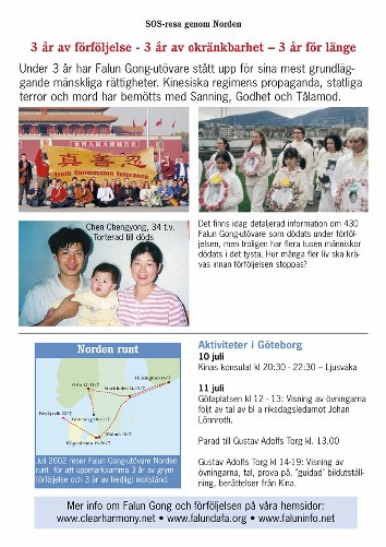 “紧急救援”北欧行于7月10日始于位于北欧中心的哥德堡市,将经过挪威首都奥斯陆、瑞典首都斯德哥尔摩、芬兰首都赫尔辛基、瑞典南方最大城市马尔默后,到达丹麦首都哥本哈根。全程共12天。“紧急救援”北欧行于7月22日在大法弟子各自所在的城市结束。