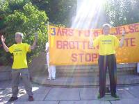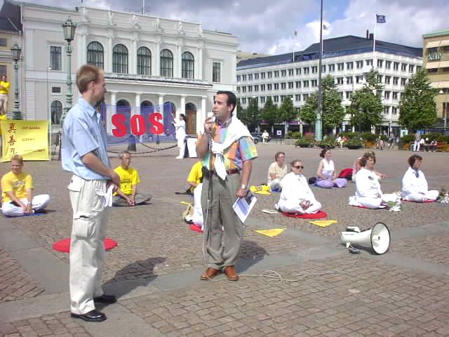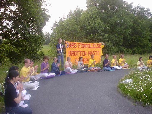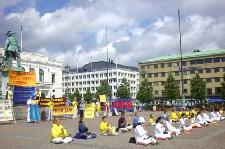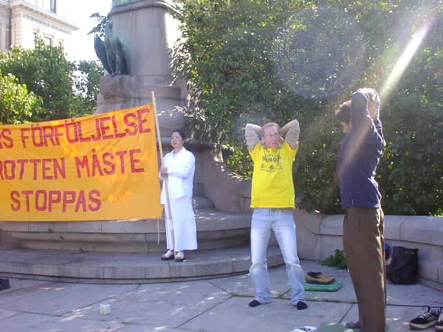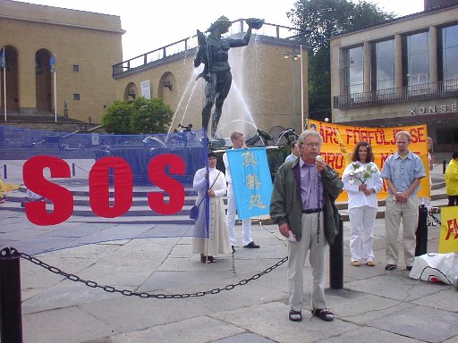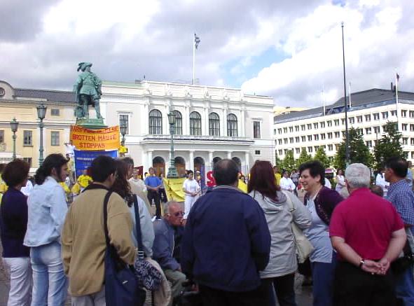 2002年7月11日12点整,原本游人很多的约达广场和阿尔道夫广场此时显得格外气派。来自瑞典各地的大法弟子聚集在这里,展开了引人注目的各色横幅。瞬间,整个广场笼罩在慈悲和严肃的气氛中。