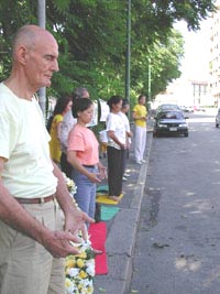 【明慧网2002年7月31日】2002年7月20日,星期六,阳光明媚,法轮功学员们在中国驻米兰领事馆前和平请愿,捍卫真、善、忍原则,同时向意大利民众