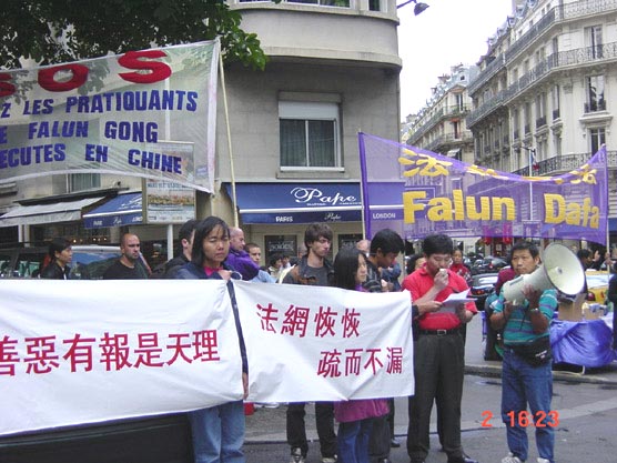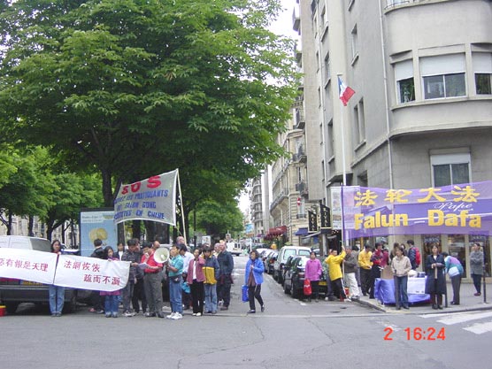 【明慧网2002年7月5日】7月3日,中国外交部长对法国进行为期一天的正式访问。这天,法国的法轮功学员聚集在中国驻法国大使馆前,呼吁中国政府做出努力,结束对法轮功的