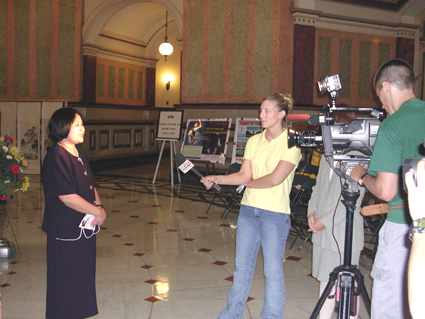 在中午12:00举行的新闻发布会上,章翠英女士表示希望通过她的作品,让人们了解法轮功的祥和、圆融及其“真、善、忍”的力量,希望大家能喜欢这个画展并能从画中感受到来自内在的美。她呼吁世界上所有善良的人们帮助中国法轮功学员获得信仰自由。她表示将义卖所得收入一半用来支持真善忍基金会,一半用来支持9.11中失去父母的儿童。