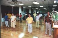 九点开始放映修炼法轮功影片老师教功带,然后由李国隆同修带领各位老师学习动作。老师都专注地学习。