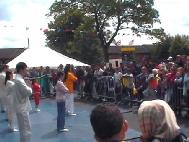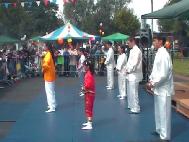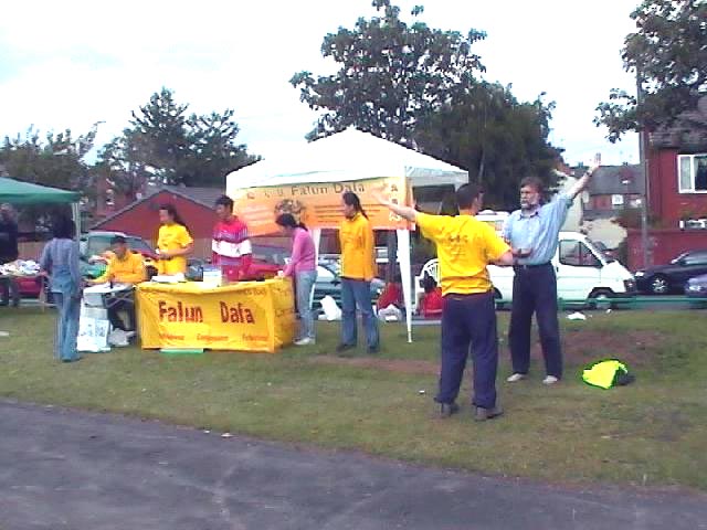 在社区节正式表演舞台上,法轮功作为第一个节目出场。大法弟子身着传统炼功服,在大法音乐的伴奏下,为现场观众表演了优美舒缓的五套功法。平静祥和的炼功场面令整日被狂歌劲舞的画面和音乐所包围的当地居民倍感新鲜。社区节节目主持人在学员表演完后致谢时特意提到法轮功的表演令他心境平和。