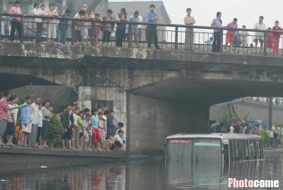 7月30日凌晨3时,突如其来的大暴雨使地势低洼的五福桥立交桥很快出现积水,尽管设在立交桥一侧的抽水泵房立即开始工作,往桥外抽水,无奈雨越来越大,大量污水从近旁污水管道中倾泻而出。至上午8时许,立交桥下积水已深达1.8米,桥洞下汪洋一片。不少小型车辆不得不绕道而行。必经此处的3辆73路、24路公交车自恃底盘较高决定斗胆一闯,不料高速冲进积水中央的公交车接连熄火,顿时陷入洪水之中动弹不得。8时10分左右,一辆长途客运汽车遭同样噩运在立交桥下“趴了窝”。4辆汽车上的20余名乘客面对浑浊一片不知深浅的积水无人敢下车涉水上岸。