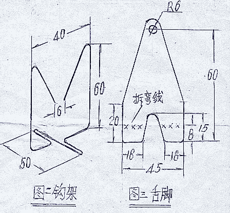 另外用牛皮纸或塑料膜或废名片剪成如图三所示舌脚,插入钩架的空隙处,按折弯线折弯,用不干胶粘牢即可。