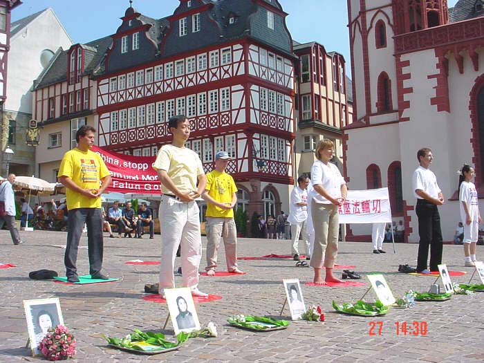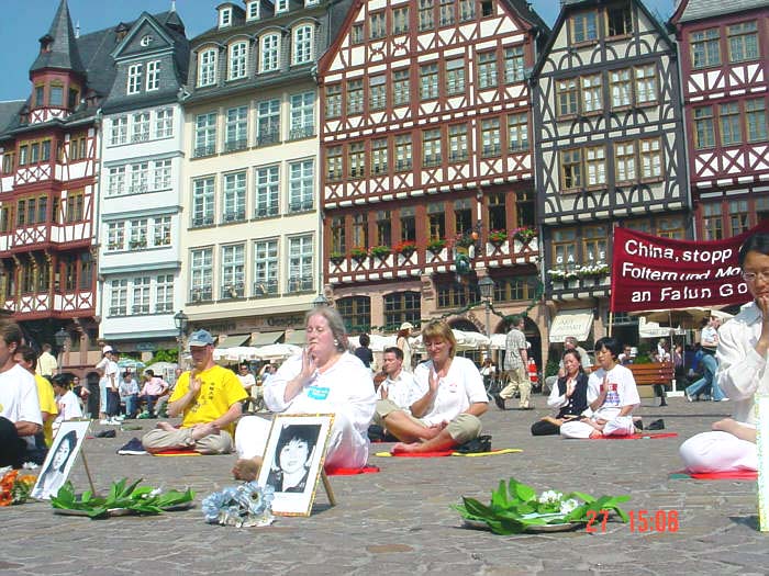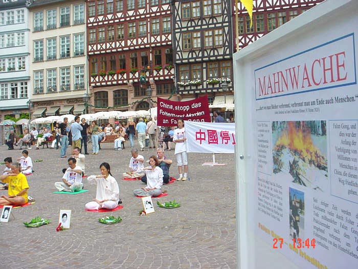在这个碑旁,为了悼念至今至少438名在中国被迫害致死的法轮功学员,法兰克福的大法弟子们于七月二十七日十点至二十点举行了静坐活动。
