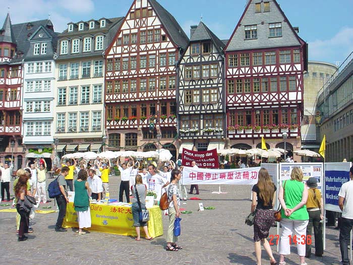 当很多德国和外国游客站在展板前时,都觉得这一切是如此地不可思议。看到演示功法的学员前面放的这么多的死难者的照片,人们问“为什么要迫害?”我们的解释使所有的人不仅仅知道了这场迫害的真相,更把这场迫害的荒唐展现在了人们眼前。许多人在国际人权协会救援的征签表上签了名。我们的行动得到了人们的理解和赞同。不断有中国人走到我们面前,惊奇地说“法轮大法?!”