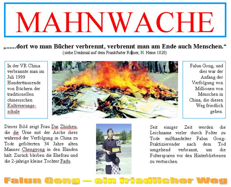 【明慧网2002年8月1日】“在焚烧书籍的地方,最终会烧毁人。”这句箴言是德国诗人Heinrich Heine在法兰克福为纳粹时期烧毁书籍而建的碑上的题词。