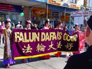 当队伍经过街道中心的主席台时,大会主持人用麦克风向市民们宣布:“这是法轮大法,源自古老的中国文化……”台上坐着坎特贝瑞市女市长、议员格瑞丰先生,市行政长官蒙格先生、纽省公众关系委员会主席克卡沙瑞昂先生等,和观看的人群以热烈掌声欢迎大法弟子队伍的经过。大法弟子们含笑地向所有支持者们挥手致意。场面感人。