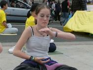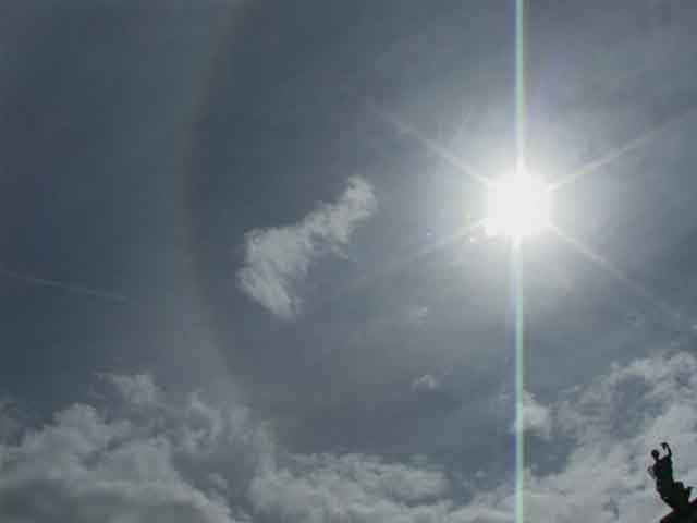 一天下来驻足的行人络绎不绝,有很多观看者表示希望来学法轮大法。学员们都感到我们的场非常纯正和强大。碧蓝的天空中,一圈彩色的光晕不时笼罩在骄阳周围,祥和慈悲,壮观异常。