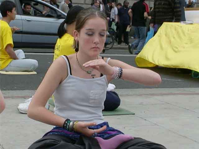 太阳周围的光晕学员为行人教功专注炼功的小女孩